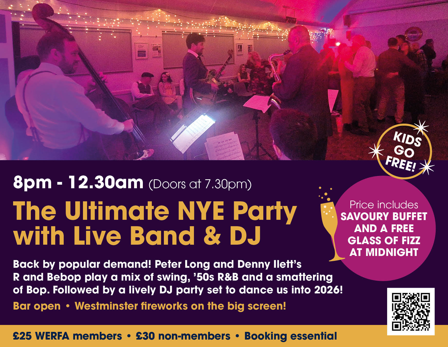 Close out 2025 with your friends and family at WERFA. Top band back by popular demand! Plus DJ party set and then the Westminster fireworks on the big screen.